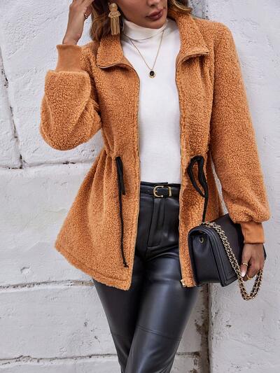 Drawstring Waist Zip Up Teddy Coat-60%