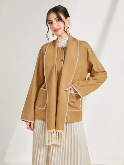 Contrast Binding Dual Pocket Tassel Trim Button Front Coat
