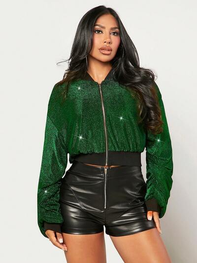 Zip Up Crop Glitter Bomber Jacket Party New Years Eve Party Sexy Club Long Sleeve Jacket