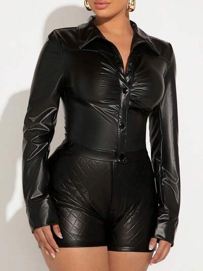 PU Button Front Patent Jacket New Years Eve Party Sexy Club Long Sleeve-60%