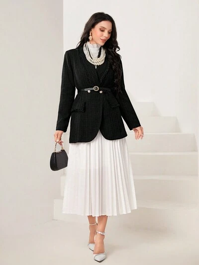 Plaid Pattern Contrast Trim Gigot Sleeve Tweed Overcoat-60%