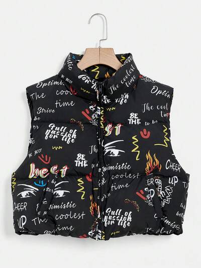 Letter Graphic Zip Up Vest Padded Coat-60%