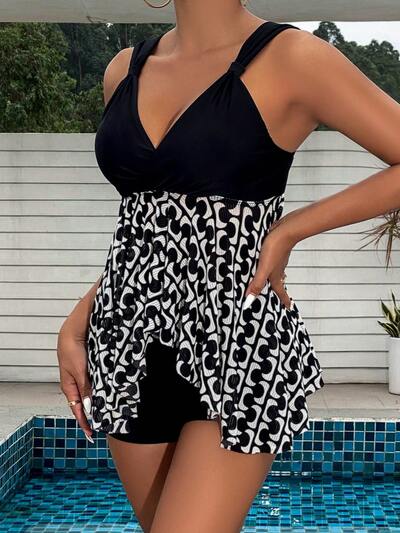 Women's Printed Splicing Swimwear Cami Top & Solid Color Boxer Shorts Swimwear Set, For Summer, Beach, Honeymoon, Travel, Vacation, Swimming Pool
