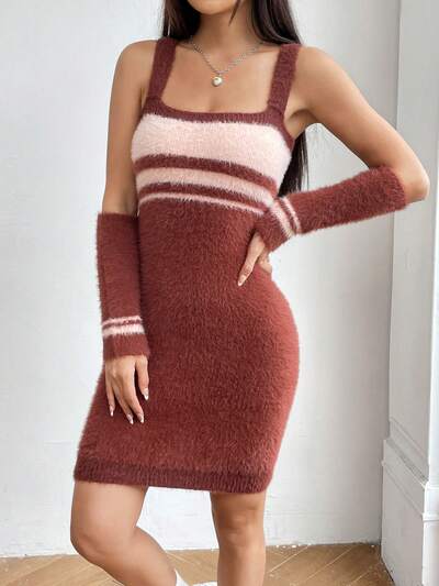 Striped Pattern Fuzzy Sweater Dress With Arm Sleeves-60%