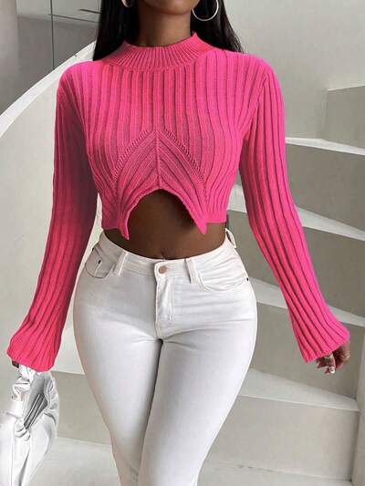 Mock Neck Asymmetrical Hem Crop Knit Pullover Fall Winter Sweater-60%