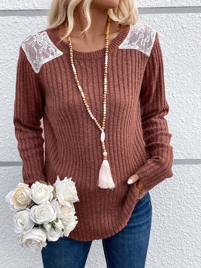 Contrast Lace Curved Hem Knit Pullover Fall Winter Sweater-65%