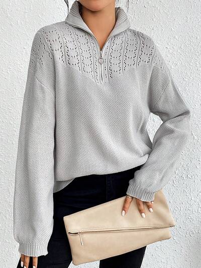 Half Zip Drop Shoulder Pointelle Knit Pullover Fall Winter Sweater-60%