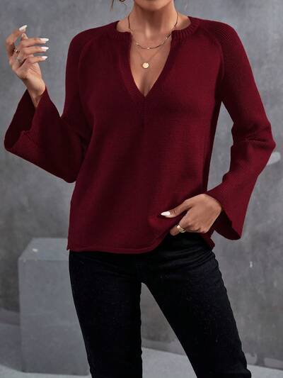 Notched Neckline Flare Sleeve Knit Pullover Fall Winter Sweater-60%