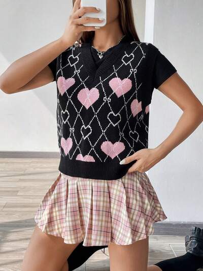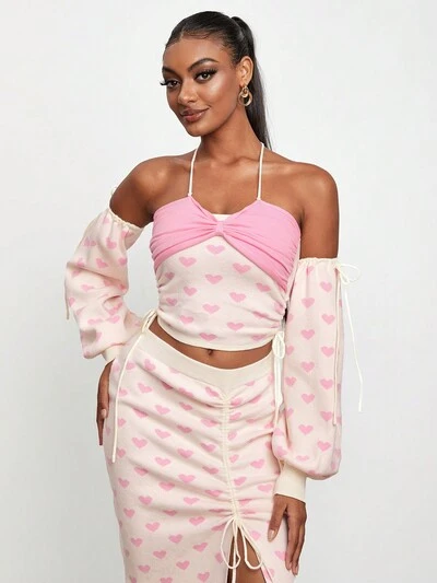 Designer Heart Pattern Drawstring Side Crop Sweater With Arm Sleeves, Fall, For Autumn & Winter, Holiday, Vacation-60%