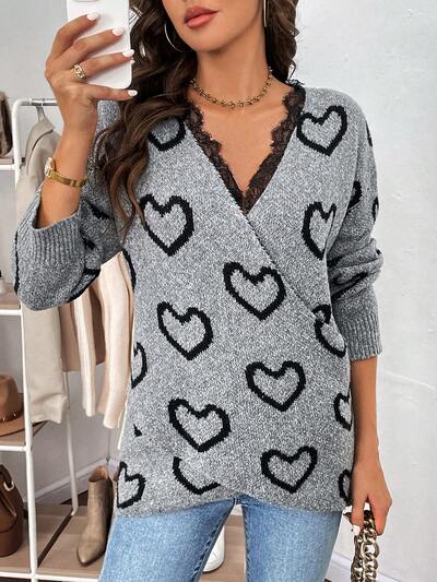 Heart Pattern Eyelash Lace Trim Drop Shoulder Wrap Cross Sweater-60%