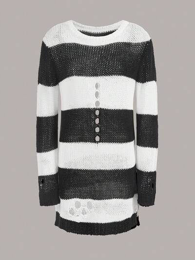 Striped Pattern Drop Shoulder Distressed Hem Sweater