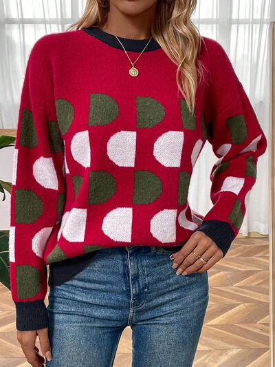Polka Dot Pattern Drop Shoulder Contrast Trim Knit Pullover Fall Winter Sweater-65%