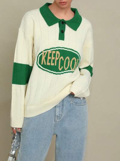 Letter Pattern Contrast Polo Neck Drop Shoulder Sweater-65%