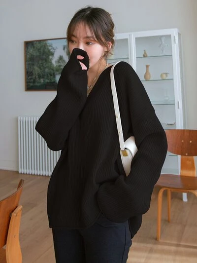 Solid Drop Shoulder Ribbed Knit Oversized Sweater,Long Sleeve Tops,Fall Women Clothes