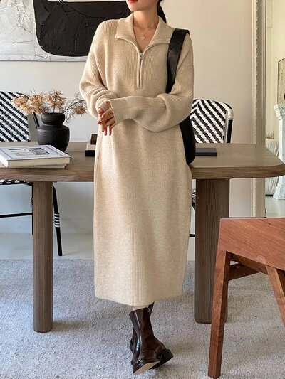 Zip Detail Drop Shoulder Sweater Dress,Fall Women Clothes