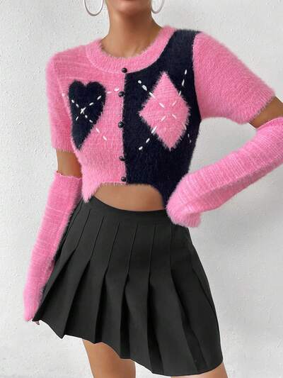 Argyle Pattern Fuzzy Crop Knit Top & 1pair Gloves-60%