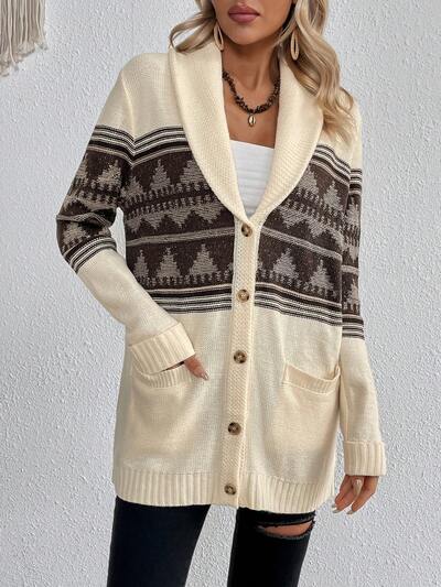 Geo Pattern Shawl Collar Dual Pocket Cardigan-60%