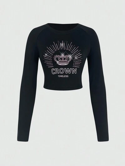 Women's Crown & Rhinestone Design T-Shirt Fall Cloth For Women-65%