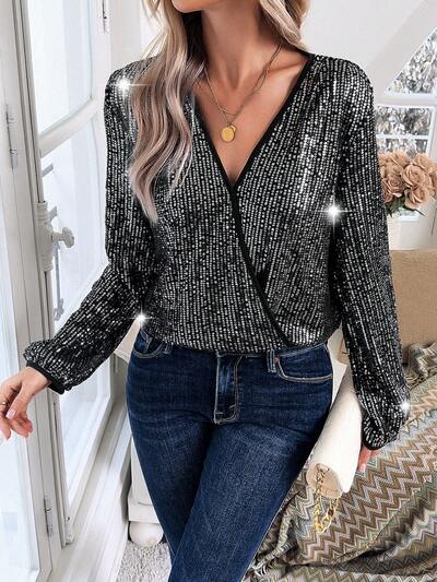 V-Neck Long Sleeve Sparkly Shirt Party Top For Women Fall Cloth For Women-60%