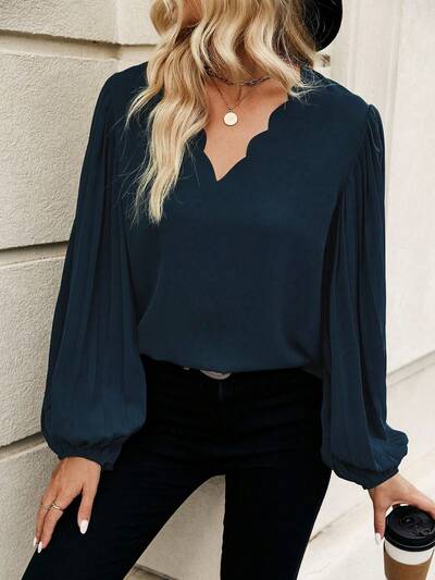 Solid Color Lantern Sleeve Shirt With Scalloped Edge Collar-65%