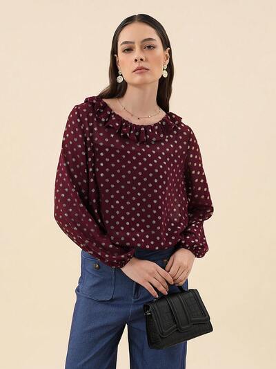 Polka Dot Print Ruffle Trim Blouse-32%