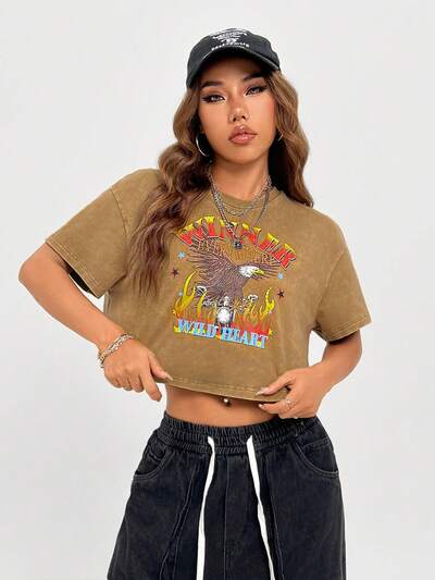 Women's Brown Eagle Heavy-Washed Short T-Shirt-32%