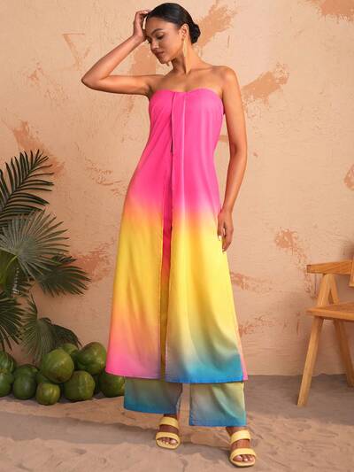Designer Boho Bohemian Women Gradient Color Printed Tube Top And Pants Set, For Summer, Holiday, Vacation, Spring, Going Out, Festival, Ibiza Fits