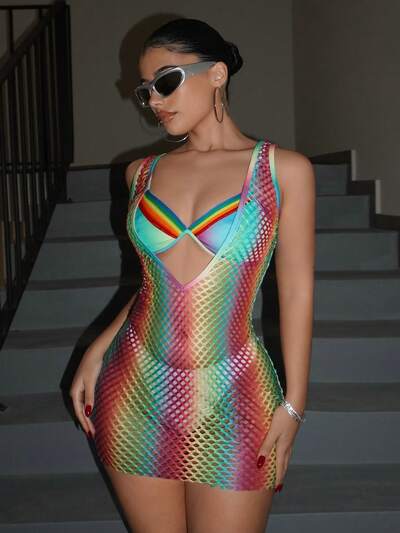 Y2k Slimming Rainbow Printed Triangle Cup Camisole Top & Deep V-Neck Fishnet Dress Set Beach Cover Ups Dress And Bra Tops Casual Women Dresses Rave Festival Outfits Summer Outfit