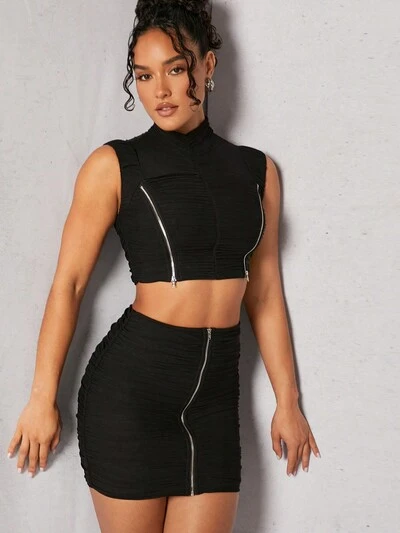 Zip Ruched Mock Neck Top & Skirt Two Pieces Set