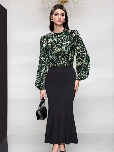 Women's Tie-Dye Lantern Sleeve Top And Solid Color Mermaid Skirt Two-Piece Set-27%