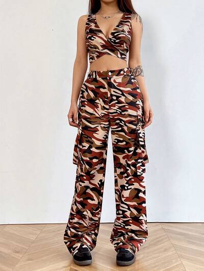 Ladies' Camouflage Printed Cross Wrap Sleeveless Top And Utility Pants Set-26%