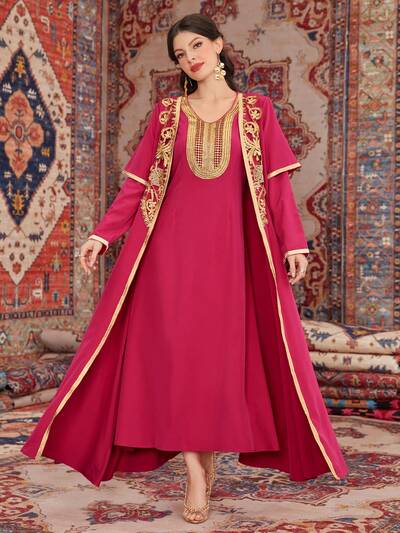 Women's Floral Decor Long Sleeve Outerwear And Dress Two Pieces Set 2 Pieces Set