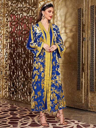 Women's Clothing Kaftan Set Of Gold Foil Floral Print Jacket And Long Sleeve Dress 2 Piece Set