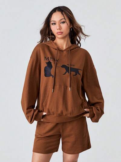 Cartoon Graphic Drop Shoulder Drawstring Hoodie & Shorts-60%