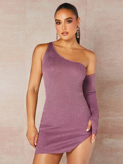 Asymmetrical Neck Split Hem Bodycon Sweater Dress-65%
