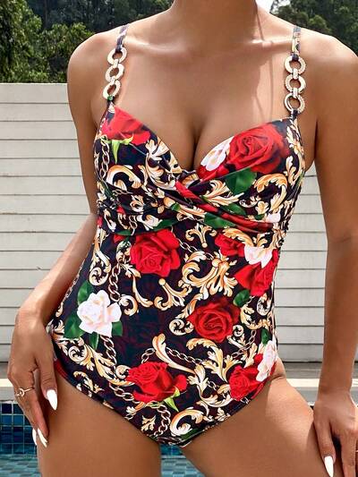 Ladies" Vacation Floral Print One-Piece Swimsuit With Cross-Cut And Metal Chain Summer-32%