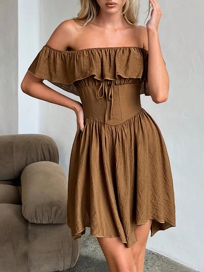 Women's Summer Seaside Holiday Solid Color Ruffled Off-Shoulder Front Tie Asymmetric Hem Short Dress-23%