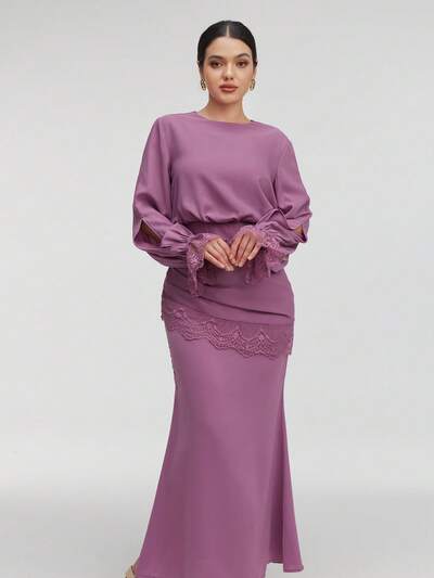 Women's Elegant Lace Paneling Cinching Waist Mermaid Hem Dress Modest-42%