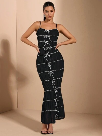 Black Mesh Perspective Combined With Contrast Color Wave Edge Bow Decoration Long Sexy And Elegant Dress-23%