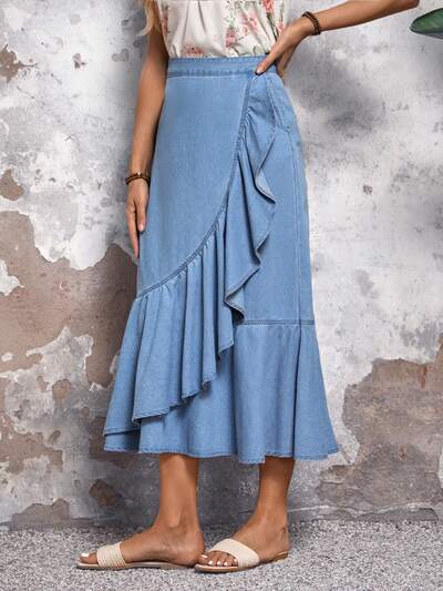 Holiday Leisure Denim Skirt With Ruffled Hem Wrap Design-60%