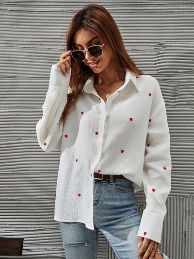 Heart Embroidery Drop Shoulder Shirt,Long Sleeve Tops Fall Cloth For Women, Christmas-32%