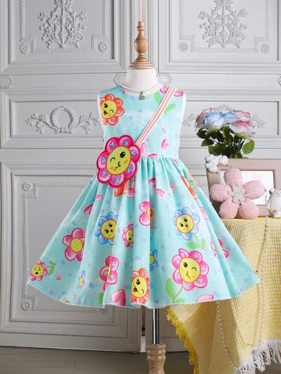 Young Girl Cute Sleeveless Dress With Face Print Suitable For Performance, Wedding, Evening Party, Birthday Party-60%