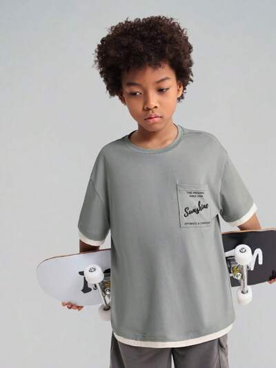 Tween Boys' Knitted Patchwork Letter Print Loose Fit T-Shirt With Pocket-43%