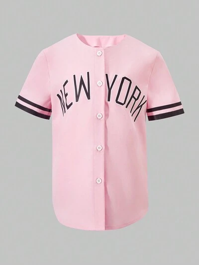Tween Girl Casual Letter & Stripe Pattern Collarless Short Sleeve Long Shirt For Summer-55%