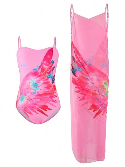 Tween Girl Wing Print Summer Beach Cami One-Piece Swimsuit & Mesh Cover Up-57%