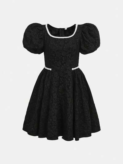 Teen Girl Fashionable Solid Color Printed Bubble Sleeve Dress-51%