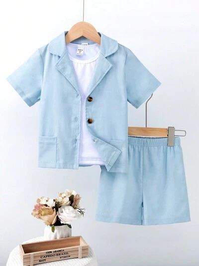 Young Boy Geometric Pattern Block Zippered Jacket With Pocket & Button-Front Shirt And Casual Shorts Two-Piece Set