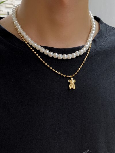 Men Bear Charm Faux Pearl Beaded Layered Necklace