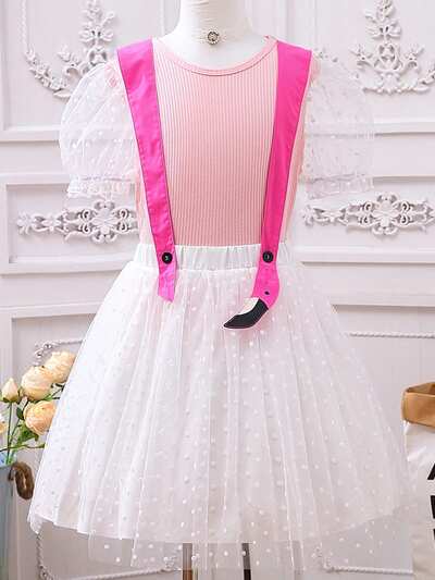 Tween Girl Elegant Polka Dot Mesh Puff Sleeve Top And Suspender Skirt Set With Color Block Design, Summer-45%