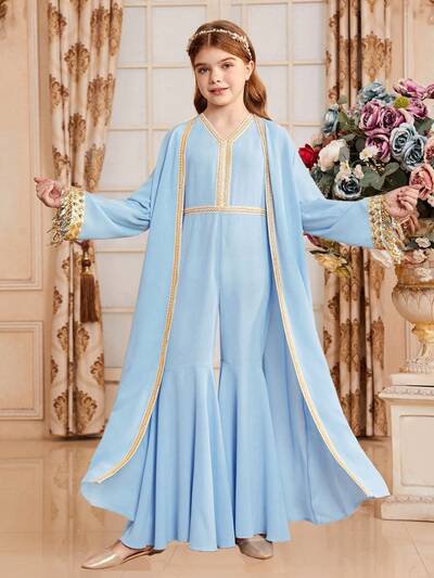 Tween Girl Loose Cute Holiday V-Neck Fringe Hem Top And Jumpsuit Set-44%